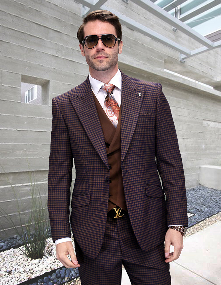 3PC Peak Lapel 1 Button Suit with Solid Color Vest. Modern Fit Flat Front Pants Super 200's Italian Wool