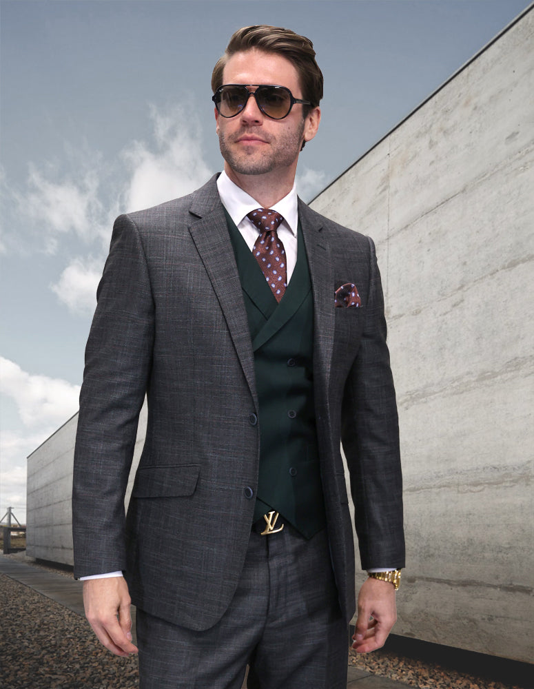 Statement Italian Wool Suit w/ Solid Color Double Breasted Contrast Solid Color Vest. Super 200's Modern Fit