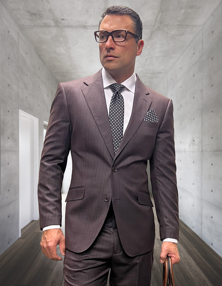 2PC Plaid Self Textured Brown Italian Wool Suits. Super 200's. Modern Fit Flat Front Pants