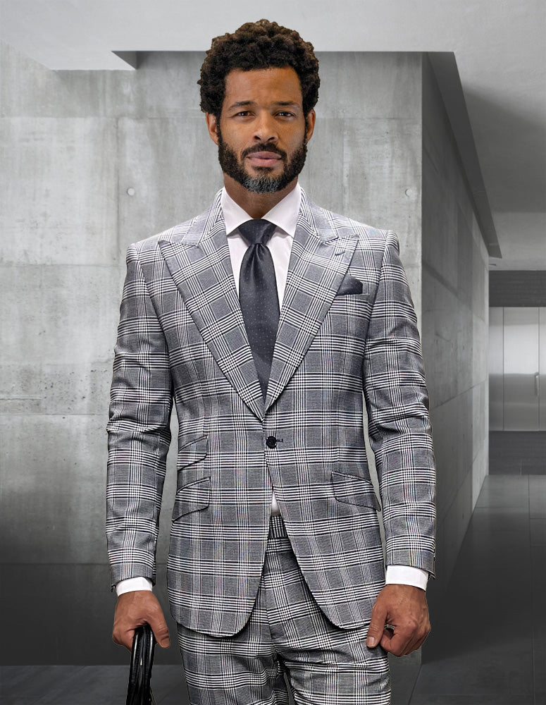2PC Gray and Black Plaid Italian Wool Suits. Super 200's. Modern Fit Flat Front Pants