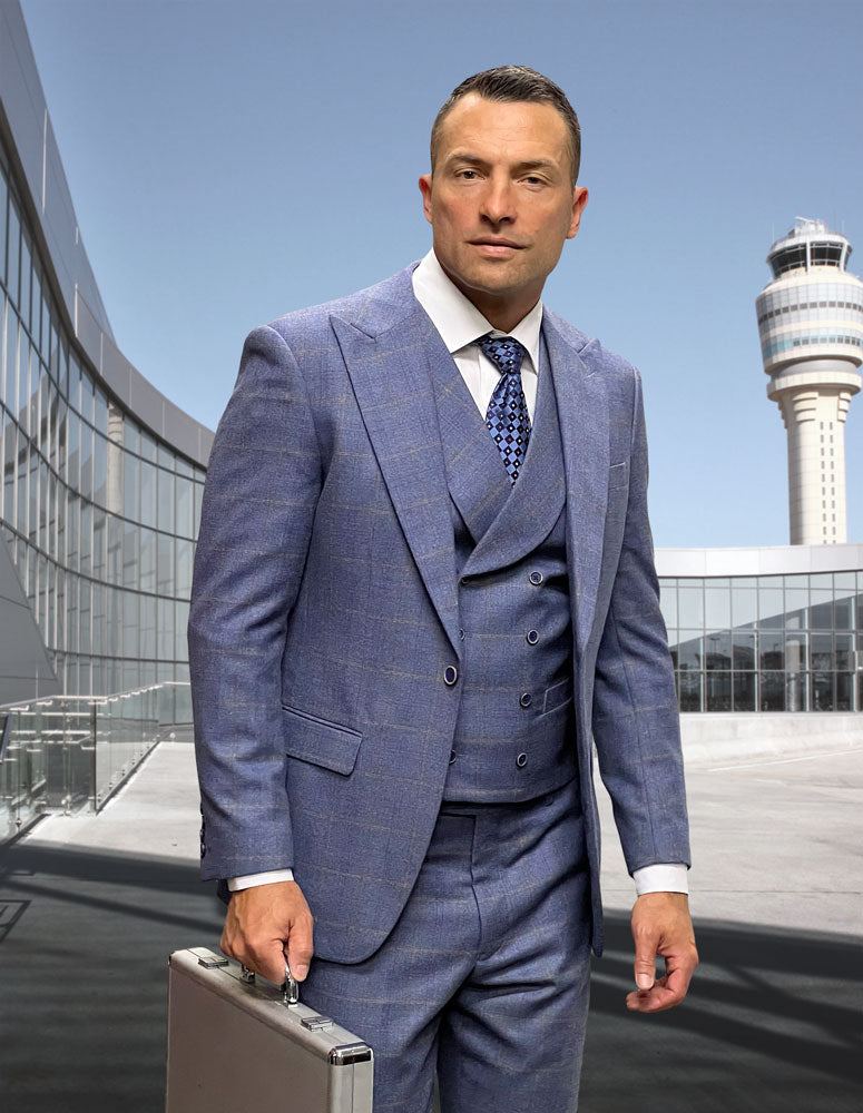 3PC SB1 Peak Lapel Plaid Suit w/ Double Breasted Vest. Super 200's Italian Wool and Cashmere